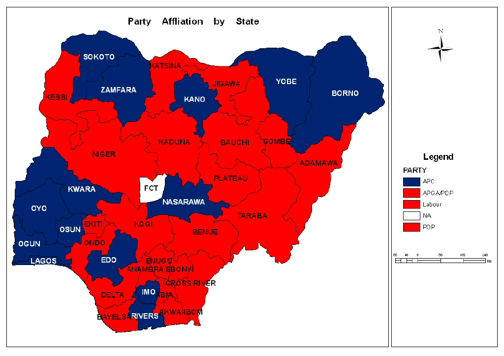 The current political alignment of state government is as follows. Note that APGA and Labour Party states have tended to ally with the ruling PDP party.
